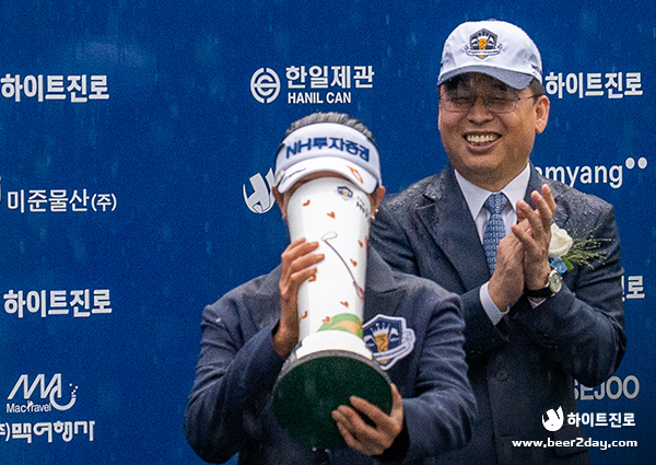 우중혈투 끝에 제22회 하이트진로 챔피언십 메이저 퀸을 차지하게 된 박민지 선수는 마지막 버디 퍼트를 성공함과 동시에 함께한 선수들이 축하하는 맥주 샤워로 우승의 기쁨을 함께 했습니다. 대회 기간동안 계속된 긴장감이 청정한 맥주에 씻겨나가는 듯했습니다.
