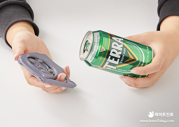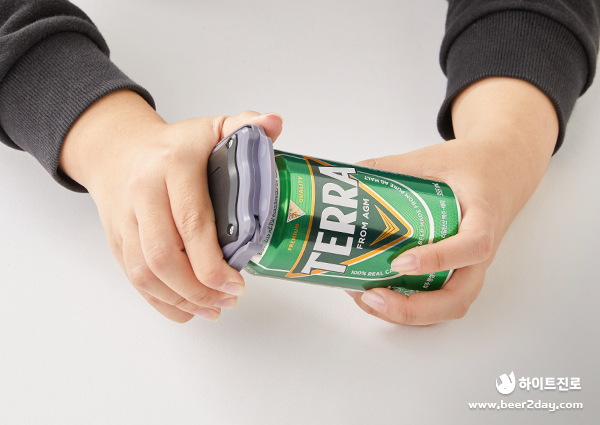 가장 먼저 캔 오프너를 이용해 테라 캔의 뚜껑을 제거해주세요. 캔을 칼이나 가위 등으로 잘라서 사용하면 날카로운 캔 절단면에 손을 다칠 수 있으니 꼭 오프너를 사용해주세요.