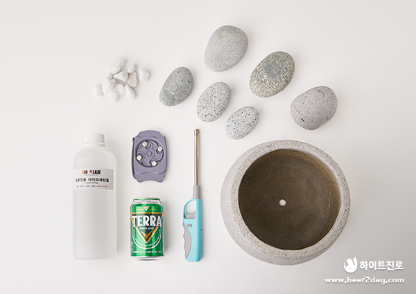 재료: 빈 테라 캔, 화분, 자갈돌, 캔 오프너, 바이오에탄올, 라이터