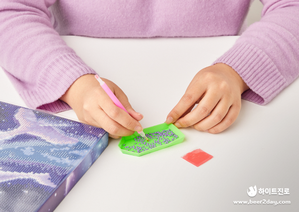 도안에 적힌 숫자나 그림과 일치하는 비즈 조각을 트레이에 부어 비즈를 정렬해준 뒤 고체 풀을 살짝 바른 펜으로 보석을 콕콕 찍어 줍니다.
