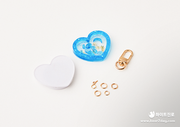 완성한 작품에 각종 부자재를 달아 키링이나 그립톡, 셰이커, 트레이 등 다양한 작품을 만들 수 있습니다. 비투지기는 하트 셰이커를 만들어 링을 달아 키링으로 완성했어요.