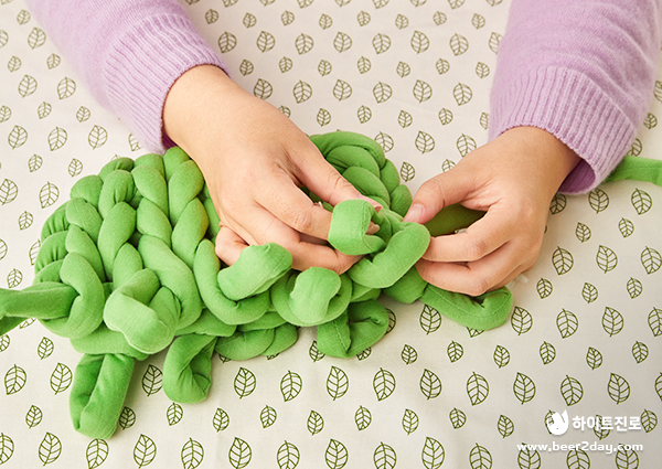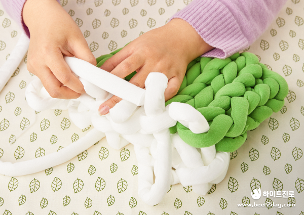 뜨개질이 익숙하지 않은 비투지기는 처음에 코 길이를 일정하게 유지하기, 힘 조절 등이 조금 어려웠지만, 생각보다 빠르게 핸드 니팅에 적응할 수 있었습니다. 처음 가방을 만들 땐 40분 정도 소요되었는데요. 핸드 니팅에 익숙해지면 미니 백 하나를 만드는 데 20~30분 정도 소요된다고 하네요.
