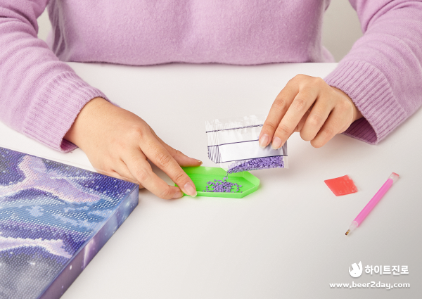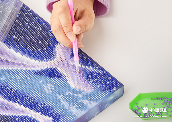 도안에 적힌 숫자나 그림과 일치하는 비즈 조각을 트레이에 부어 비즈를 정렬해준 뒤 고체 풀을 살짝 바른 펜으로 보석을 콕콕 찍어 줍니다.