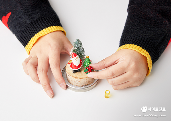 뚜껑이 잘 닫히는 것까지 확인했으면, 피규어를 배치해주세요. 비투지기는 크리스마스 분위기를 살려 트리와 산타, 선물상자, 맥주 피규어를 붙여주었습니다. 피규어를 붙일 땐 워터볼을 흔들어도 떨어지지 않도록 단단히 고정해주세요.