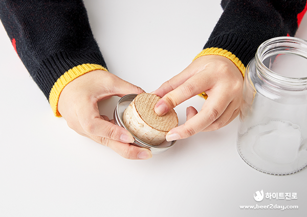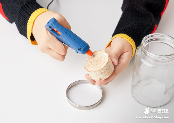 먼저 병뚜껑의 높이를 조절해야 합니다. 병목이 길면 피규어가 병목에 가려 잘 보이지 않기 때문인데요. 블록 장난감 조각이나 병뚜껑 등을 활용하면 좋습니다. 비투지기가 가져온 병은 병목이 긴 편이라 두께가 있는 나뭇조각을 붙여주었습니다. 유리병이 닫힐 수 있게 병 입구보다 작게 단을 쌓아주는 것도 잊지 마세요!