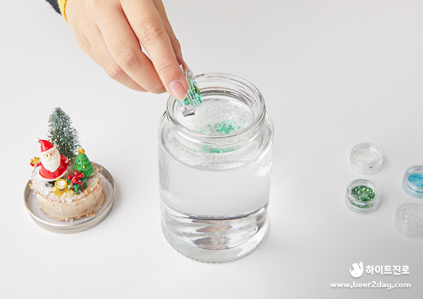 원하는 색상의 글리터 파우더를 넣어주세요. 비투지기는 청정라거 테라를 닮은 초록색 글리터와 겨울 분위기를 한껏 살려줄 흰색과 은색 글리터를 함께 섞어주었습니다.
