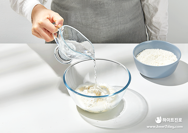 4. 튀김가루에 탄산수를 넣어 튀김 반죽을 만들어주세요.