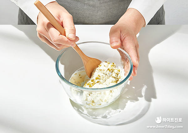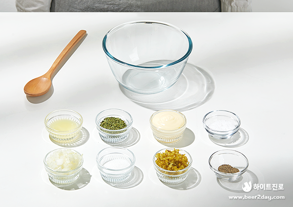 마요네즈 4큰 술, 레몬즙 1큰 술, 다진 양파 2큰 술, 다진 오이피클 ⅓ 컵, 소금 ½ 작은 술, 후추 약간, 파슬리 가루