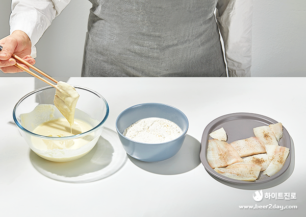5. 밑간을 한 흰살생선(전감)에 튀김가루와 튀김 반죽을 한 번씩 묻혀주세요.