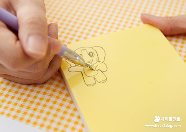 먼저 연필을 이용해 도안의 테두리를 따줍니다. 이 테두리는 이후 도장의 모양이 되고, 그 외 부분은 칼로 파내야 할 불필요한 부분이 됩니다. 그래서 테두리는 되도록 두껍게 그려주는 것이 좋습니다. 테두리 선이 완성된 도안은 한 쪽에 둡니다.