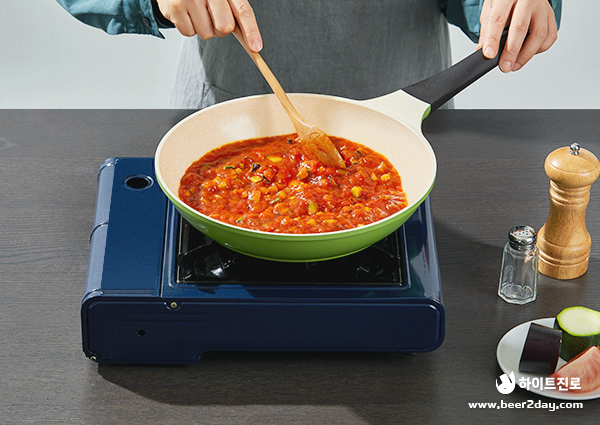토마토소스 200ml, 양파 3T, 쥬키니 호박 2T, 토마토 3T, 가지 3T, 올리브오일 1T, 후추, 소금