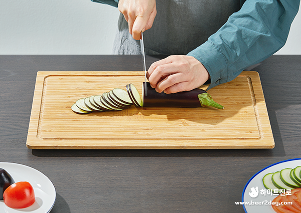 2. 가지와 토마토도 호박과 같은 개수만큼 0.5cm 두께로 썰어줍니다.