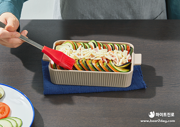 10. 실리콘 붓을 사용하여 채소 위에 올리브유를 얇게 발라주세요.