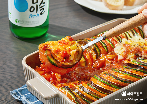 깨끗한 맛의 대명사, 한국 대표 소주 참이슬과 프랑스 가정식 라타투이의 만남! 형형색색 화려한 비주얼과 뭉근히 끓여 깊어진 채소 스튜 라타투이는 일교차로 추워진 초봄 날씨에 몸을 따뜻하게 해주는 안주로도 손색이 없습니다. 오늘은 몸과 마음이 따뜻해지는 라타투이로 하루를 마무리해 보는 것은 어떨까요?