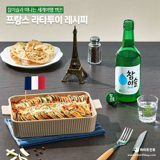 새로운 시작과 따스한 봄을 알리는 3월이 돌아왔습니다. 봄에 점점 가까워지는 시기인 만큼 낮과 밤 일교차도 엄청난데요. 이럴수록 건강을 챙길 수 있는 음식들로 몸과 마음을 따뜻하게 유지하는 것이 중요합니다. 3월 참이슬이 소개하는 이국적인 레시피! 건강한 채소들을 썰어 뭉근히 끓여 따뜻하고 건강한 프랑스 음식 라타투이를 소개할까 합니다. 참이슬과 함께하는 세계여행 11탄! 미식의 나라 프랑스로 떠나봅니다.