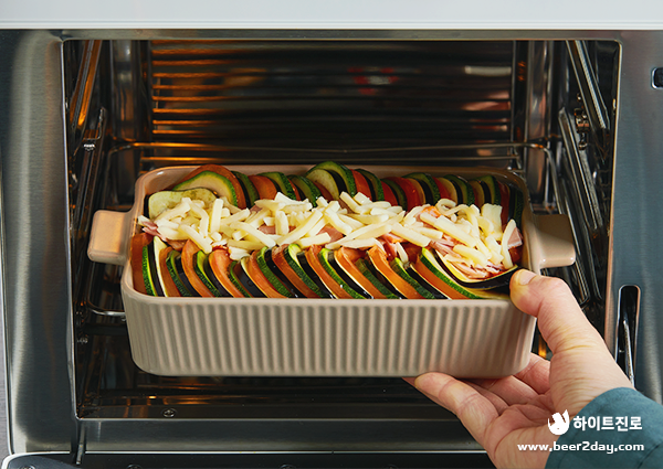 베이컨 15g, 쥬키니 호박 반개, 토마토 2개, 가지 1개, 모차렐라치즈 60g, 올리브오일 1T