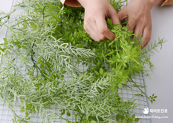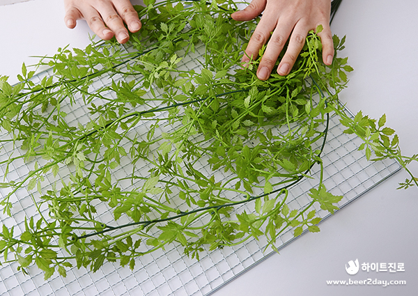 제일 먼저 잎이 연하고 가장 작은 남천 잎부터 위치를 잡아줍니다. 엮여 있는 덩굴들은 잘 풀어준 뒤 그릴 망 위에 구멍을 메꿔준다는 느낌으로 덮어주세요!