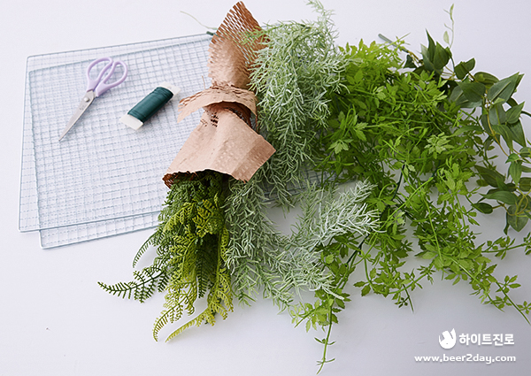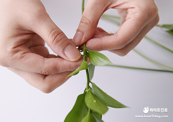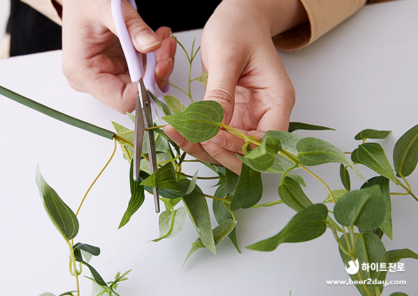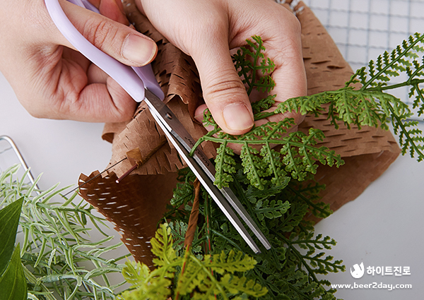 다음은 스프링 게리 나뭇잎을 엮어줍니다. 빈 곳을 채운다는 느낌으로 위치를 잡아주는데 이때 인조 식물의 크기를 서로 다르게 잘라서 묶어주면 더욱 자연스럽게 표현됩니다.