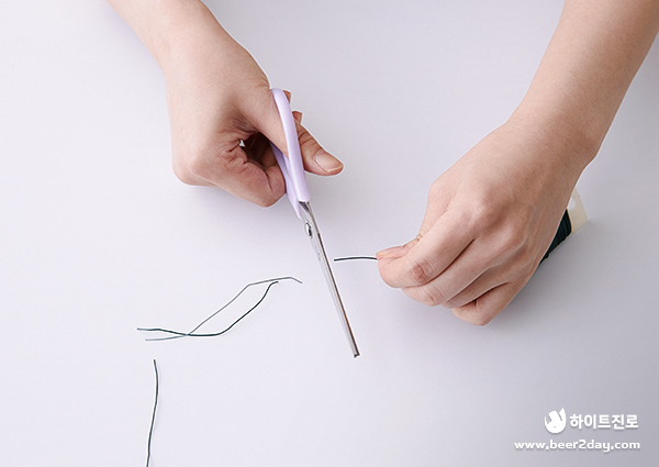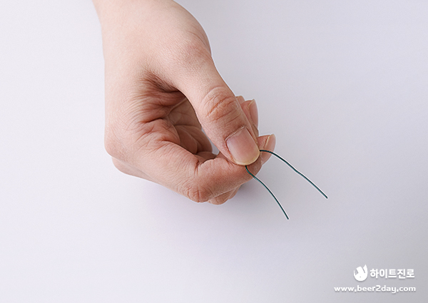 먼저 꽃철사를 가위로 약 4~5cm 길이로 잘라줍니다. 잘라준 철사는 반으로 접어 한 쪽에 잘 놓아주세요.