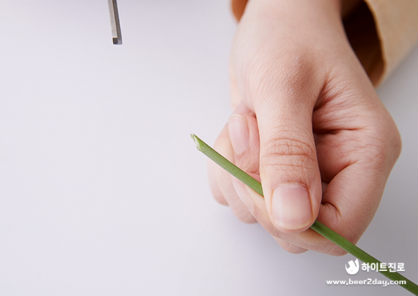 먼저 식물의 줄기를 대각선으로 잘라줍니다. 단면을 깔끔하게 한 번에 자르는 것이 좋은데 이때 원예 가위를 사용하면 더욱 좋습니다. 화병에 꽂을 때 모두 같은 높이로 세워져 있으면 투박해 보이기 때문에 서로 길이를 다르게 잘라주세요.