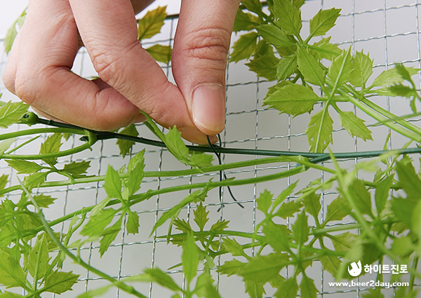 불필요한 가지 부분은 가위로 제거한 뒤 철사를 엮어 고정합니다. 반으로 접어둔 철사를 사용하면 쉽게 묶을 수 있습니다.