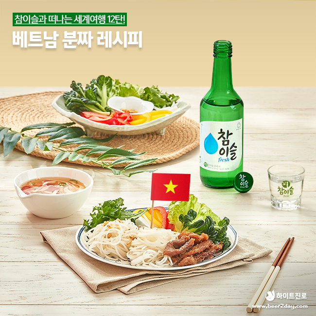 꽃과 새싹이 자라는 따뜻한 4월입니다. 맑고 산뜻해지는 날씨에 국내외로 여행을 떠나는 분들이 많은데요. 이번 봄 여러분들의 여행지는 어디인가요? 4월 참이슬이 소개하는 이국적인 레시피! 베트남 대표 피시소스로 만들어진 느억맘 소스에 싱싱한 야채, 양념 돼지고기를 적셔 먹는 새콤달콤한 조합의 베트남 음식 분짜를 소개할까 합니다. 참이슬과 함께하는 세계여행 12탄! 여행도 음식도 우리에게 친숙한 베트남으로 떠나봅니다.