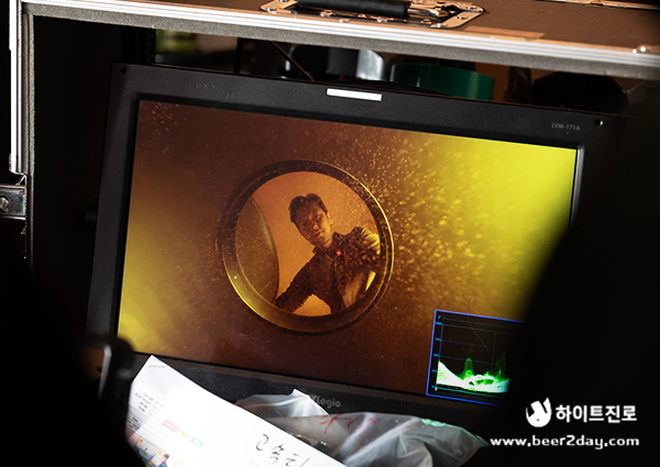 다음 장면에서는 부드러운 거품 속 탄산이 터지는 비주얼을 드라마틱하게 표현했는데요! 실제로 대형 유리 스퀘어에 켈리를 가득 담아 촬영했습니다.🍻