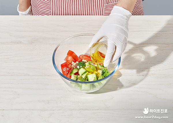 12. 볼에 올리브유, 레몬즙, 소금, 꿀, 후추, 토마토, 오이, 다진 마늘을 골고루 섞어서 샐러드를 완성해 주세요.
