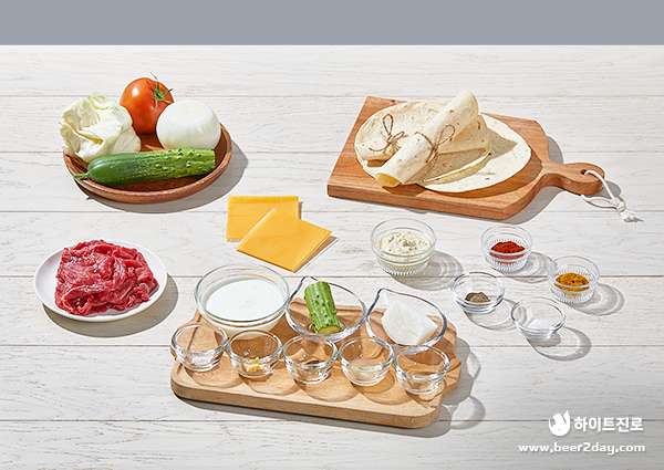 난 3장, 불고기용 소고기 200g, 치즈 1장, 오이 ¼개, 양파 ¼개, 양배추 ⅛개, 토마토 ¼개, 마요네즈, 홀그레인머스타드, 카레 가루 1T, 훈제 파프리카 가루 ½T, 소금, 후추