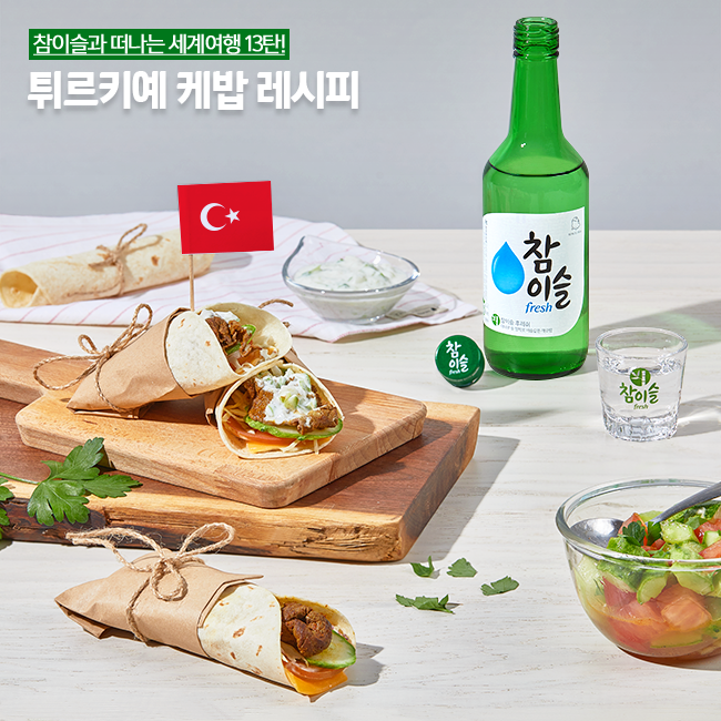 때 이른 더위로 조금씩 땀이 맺히는 요즘, 뜨거워지는 날씨에 식사는 거르고 차가운 음료만 가까이하는 분들이 많은데요. 날씨가 더워질수록 맛있고 좋은 음식들로 식사에 신경 써야 합니다. 💪 5월 참이슬이 소개하는 이국적인 레시피! 오늘은 향신료로 맛을 낸 고기와 싱싱한 채소를 고소한 난에 싸서 먹는 튀르키예 전통 음식 케밥과 건강한 오이 토마토 샐러드를 소개할까 합니다. 참이슬과 함께하는 세계여행 13탄! 형제의 나라 튀르키예로 떠나봅니다.