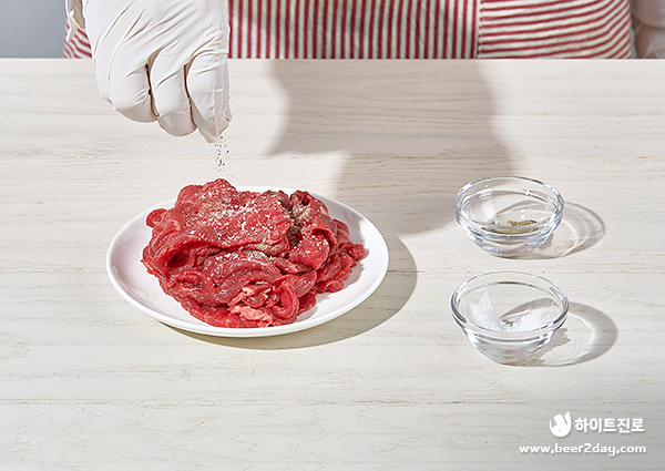 1. 불고기용 소고기 200g에 소금과 후추로 밑간을 해주세요.