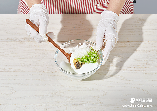 7. 볼에 요거트를 넣고 잘게 썬 양파와 오이, 다진 마늘, 소금, 식초, 레몬즙, 후추를 넣어 섞어주세요.