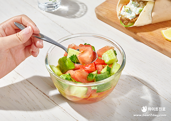 참이슬과 튀르키예 대표 음식 케밥의 만남! 간간한 고기와 싱싱한 채소의 조화를 자랑하는 케밥은 든든한 저녁 안주로도 손색이 없네요👍 오늘은 간편한 케밥과 건강하고 싱싱한 토마토 오이샐러드를 소개해 드렸습니다. 오늘도 내일도 깨끗한 참이슬이 소개하는 세계 요리 레시피, 다음 여행지도 기대해 주세요!