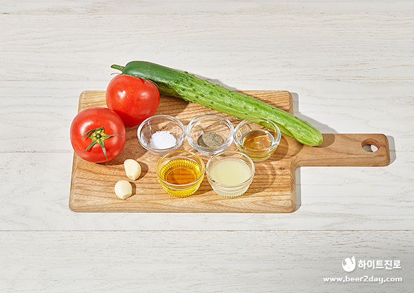 토마토 2개, 오이 ½개, 마늘 2개, 올리브유 3T, 레몬즙 2T, 후추, 소금 ½T, 꿀 1T