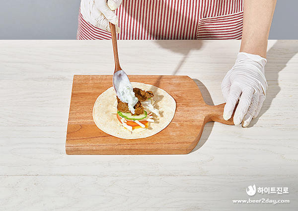 8. 구워 둔 난 위에 마요네즈와 홀그레인머스타드 섞은 소스를 얇게 바르고 치즈, 양배추, 양파, 오이, 불고기, 차지키 소스를 순서대로 올려주세요.