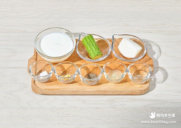 양파 ¼개, 오이 ¼개, 요거트100g, 다진 마늘 ½T, 소금 ¼T, 후추 ½T, 레몬즙 ½T, 식초 ½T