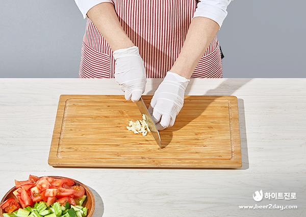 11. 토마토와 오이를 한입 크기로 자른 후 마늘을 굵게 다져주세요.