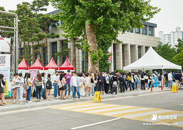 수업이 끝난 오후, 축제의 설렘으로 가득한 캠퍼스 분위기!😀 정문을 지나자 더운 날임에도 삼삼오오 모여 있는 학생들을 만나볼 수 있었습니다. 대동제를 즐기기 위해 밝은 표정으로 기다리는 학생들을 보니 비어투데이도 함께 줄서기에 동참하고 싶은 마음이었는데요…😅