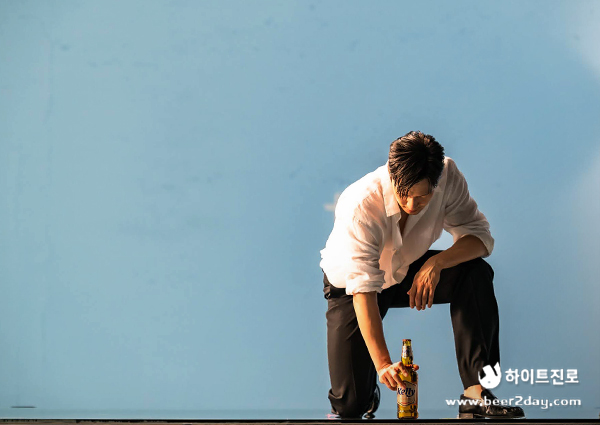 드디어 라거의 반전 켈리와 인간 켈리 손석구 님의 만남! 이번엔 단상 위에 올라가서 촬영을 한 장면인데요, 배우님이 시원~한 액션으로 켈리 병을 바닥에 내리꽂는 모습! 카리스마 있는 모습이 왠지 영화 속 슈퍼 히어로를 보고 있는 것 같지 않나요?😳