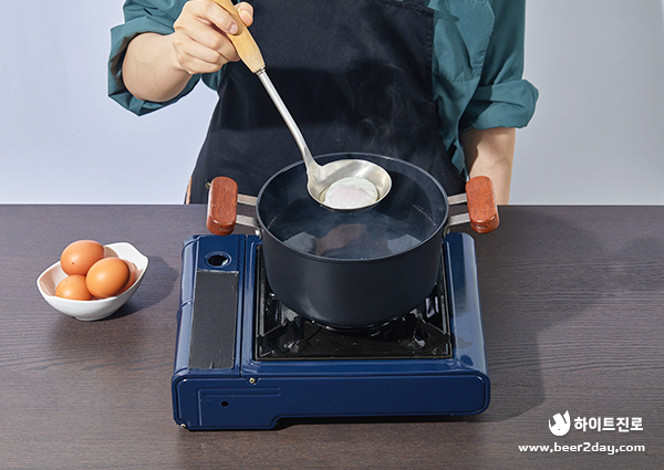 6. 끓는 물에 식초를 넣어 회오리를 만든 뒤 계란을 넣어 수란을 만들어 줍니다.