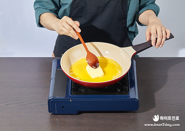 8. 예열한 팬에 버터 200g을 넣고 갈색빛이 나지 않도록 약불에서 녹여주세요.