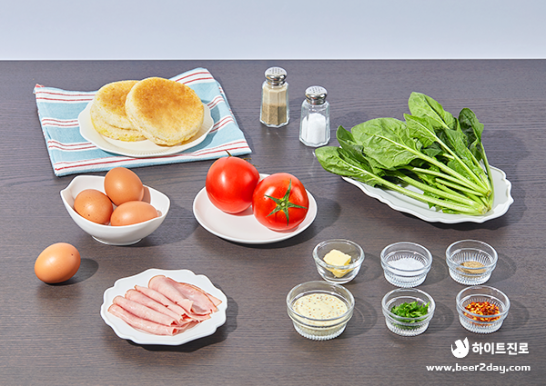 달걀 2개, 잉글리쉬 머핀 2개, 토마토 2개, 시금치 30g, 슬라이스햄 4장, 버터 한 큰술, 소금 1/4T (한 꼬집), 후추 1/4T (한 꼬집), 마요네즈 2T, 씨겨자 1T, 이태리파슬리 약간, 페페론치노 약간