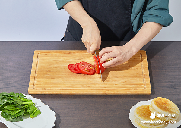 2. 함께 세척한 토마토는 0.5cm 정도의 두께로 얇게 썰어 준비해 주세요.