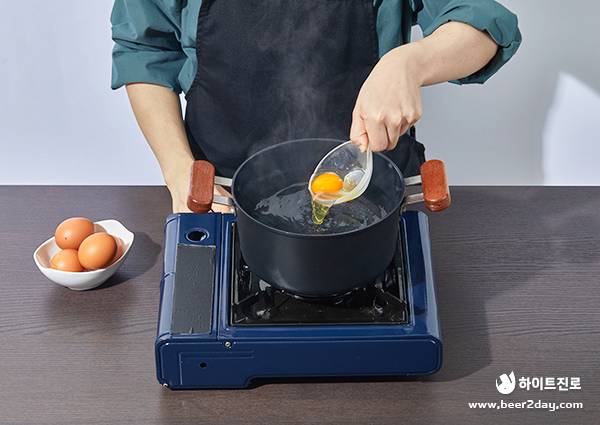 6. 끓는 물에 식초를 넣어 회오리를 만든 뒤 계란을 넣어 수란을 만들어 줍니다.