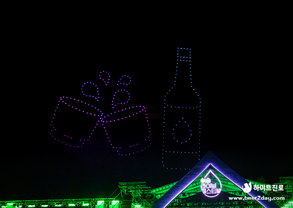 화려한 무대가 막이 내리고, 또 다른 이벤트가 준비되어 있었는데요. 바로 이라페의 하이라이트 드론 쇼와 불꽃 쇼! 드론으로 만들어 낸 깜찍한 진로 두꺼비와 참이슬, 켈리 모습이 밤하늘을 수놓자 주변에선 연신 탄성과 카메라 소리가 가득 했습니다.