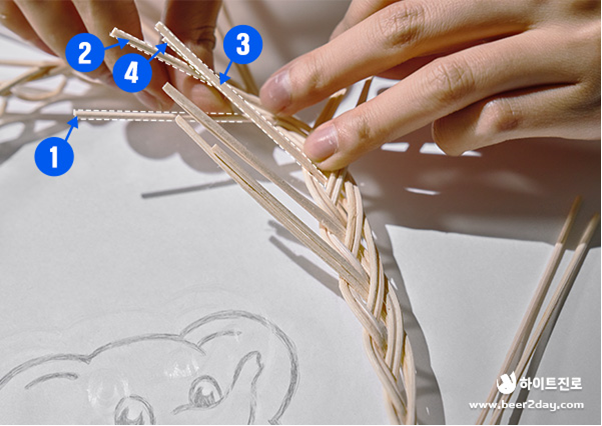 엮인 상태를 유지하고 2번 날대가 3번 날대의 위, 4번 날대의 아래로 오도록 엮은 후 2번의 남은 날대 부분을 잘라줍니다.