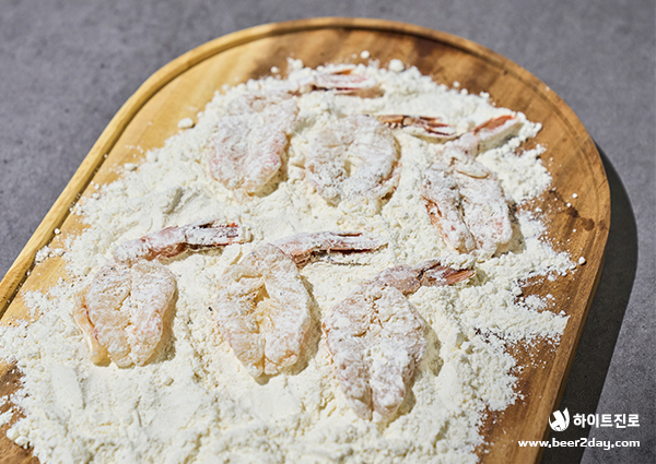 5. 이제 밀가루를 준비하고 새우에 밀가루를 골고루 입혀줍니다.