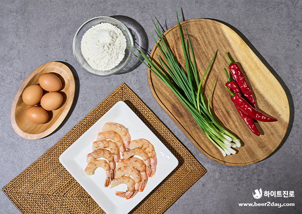 새우, 쪽파, 홍 고추, 계란, 밀가루, 소금, 후추