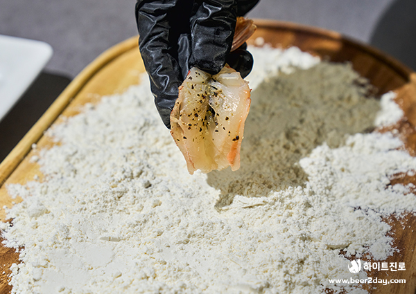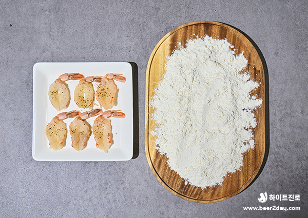 5. 이제 밀가루를 준비하고 새우에 밀가루를 골고루 입혀줍니다.