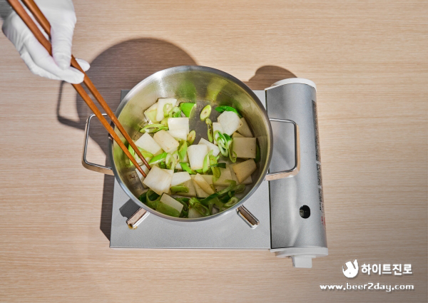 1. 무는 적당한 크기로 나박 썰고 대파는 어슷 썰어줍니다.